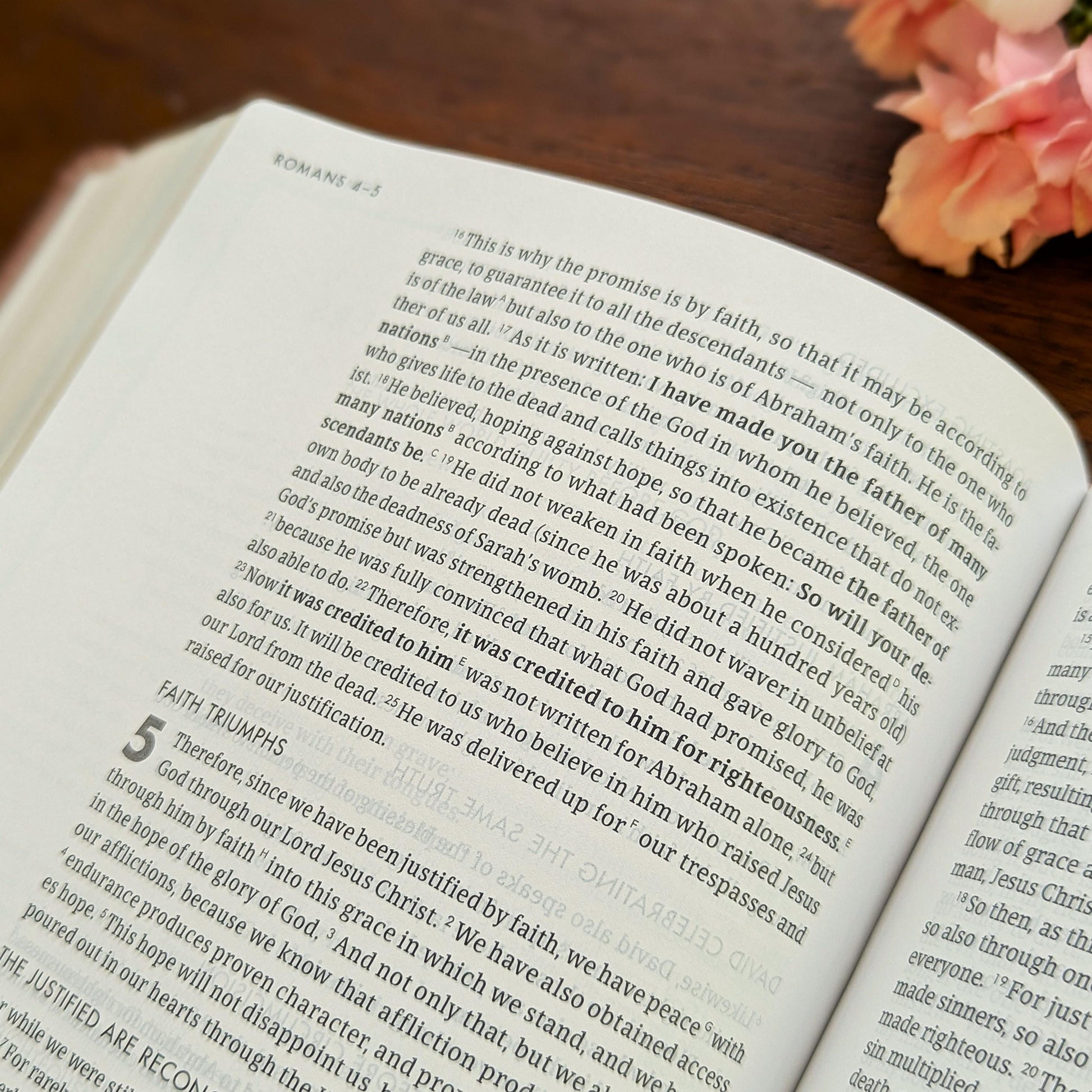 Designed to inspire women to engage deeply with Scripture and live it out daily. With a beautiful rose gold Leatherlike cover and a thoughtfully crafted interior layout, this Bible invites reflection, creativity, and deeper spiritual growth.