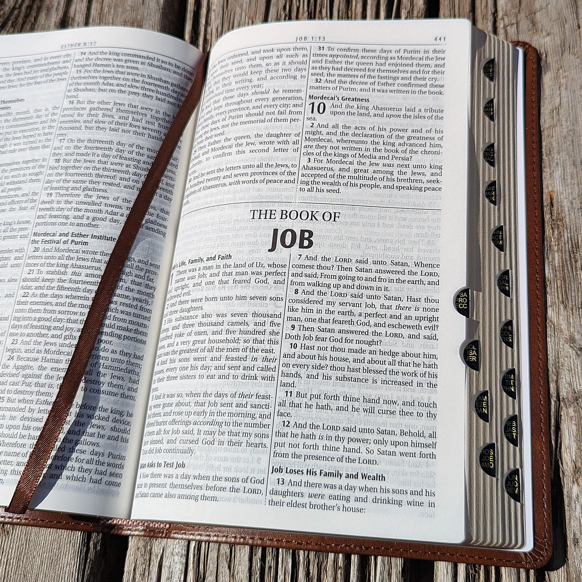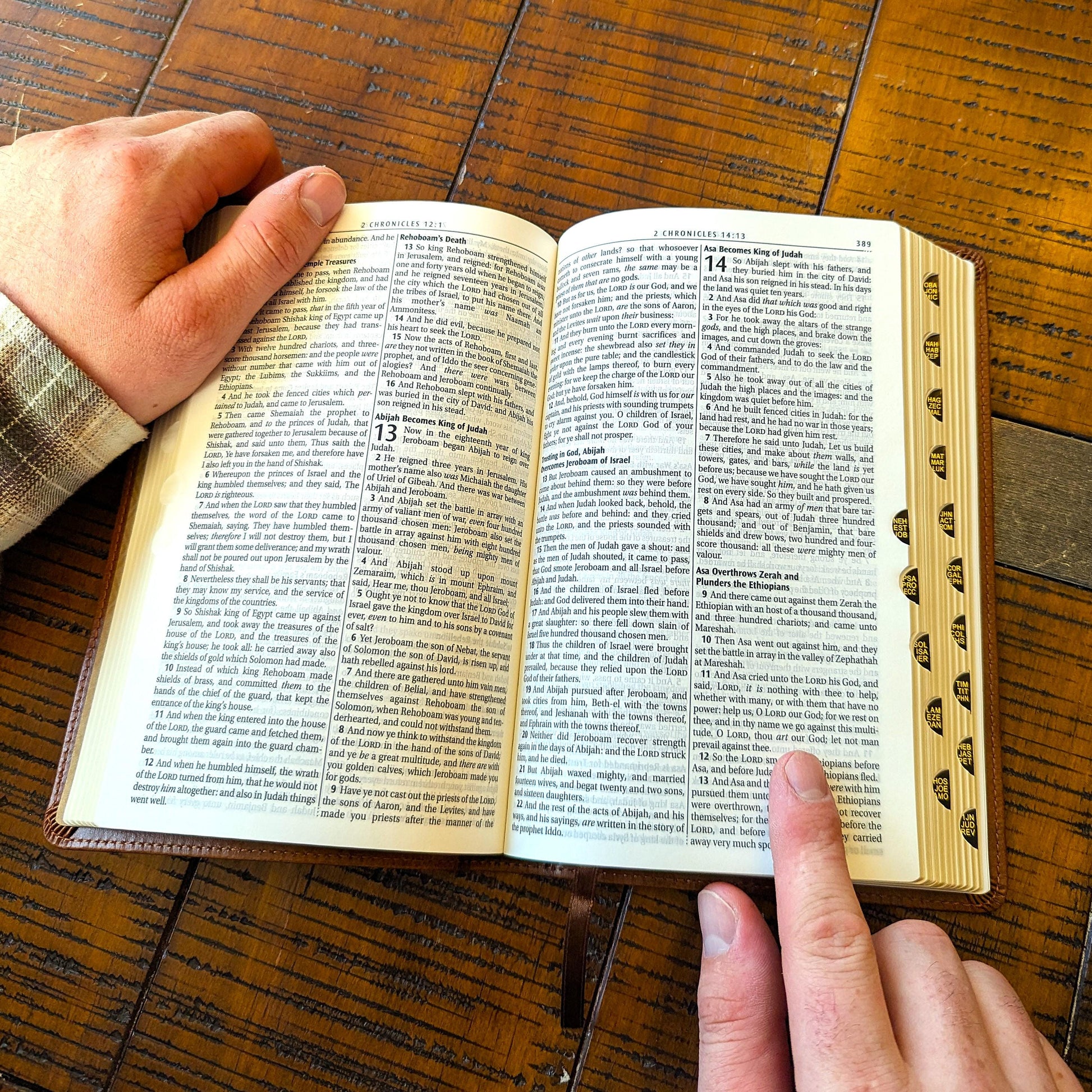 Crafted to Perfection, our Bibles design is appealing from the beautiful leather-like cover to the gilded pages with large 9 point font that is nice on the eyes. The easy to read double-column text with thumb index tabs are perfect to reflect on God’s Word and enhance your study.