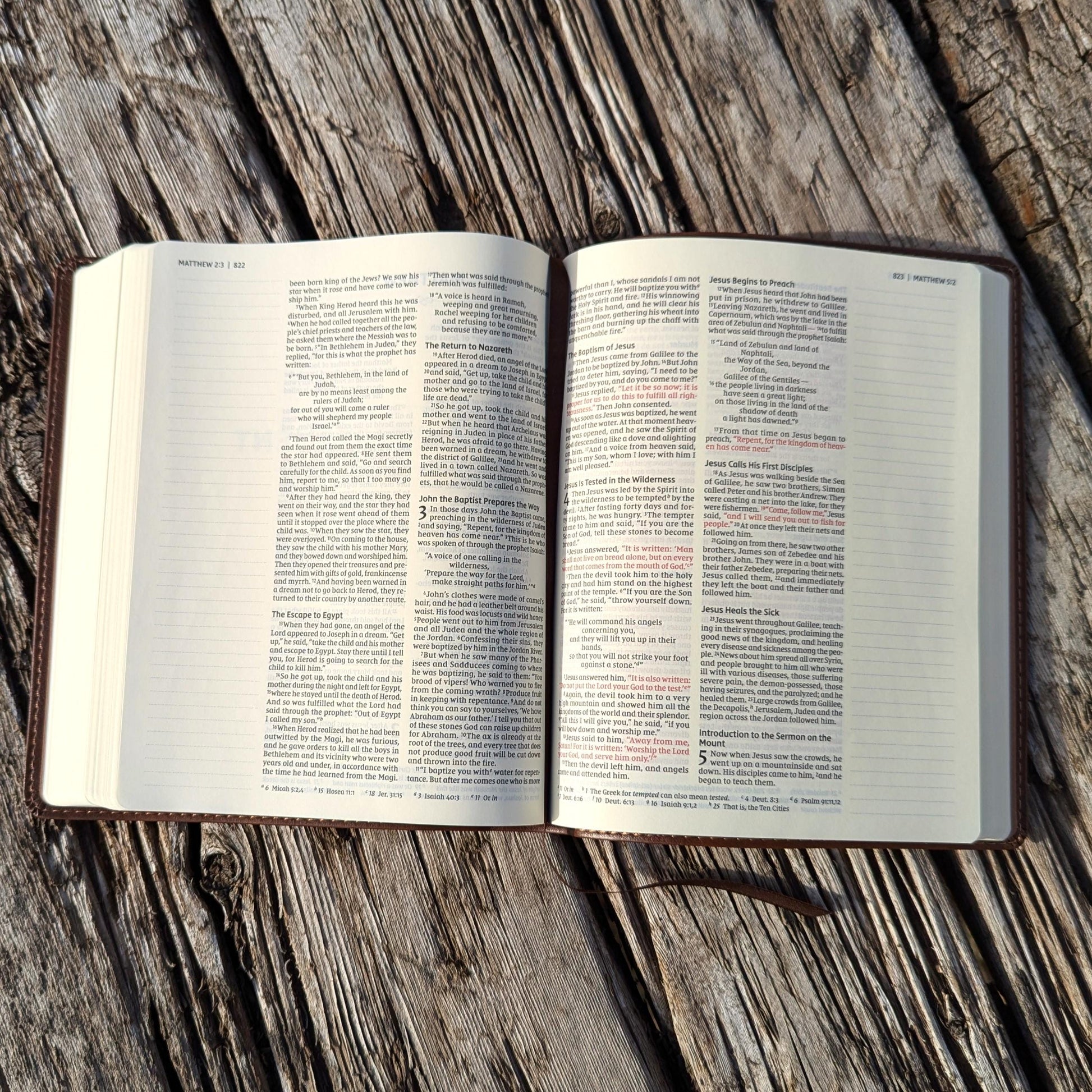 BIBLE FEATURES – New International Version (NIV) Journaling Bible custom laser-engraved with your name! Includes lined, wide margins for notes and personal reflections with thick cream paper for enduring notetaking. The double-column layout keeps it portable at just 9”x7.25”x1.5”. Features a satin ribbon marker, red-letter text for the words of Jesus, and a leather-like cover lies flat when open. Comfortable 8-point font size for easy reading.